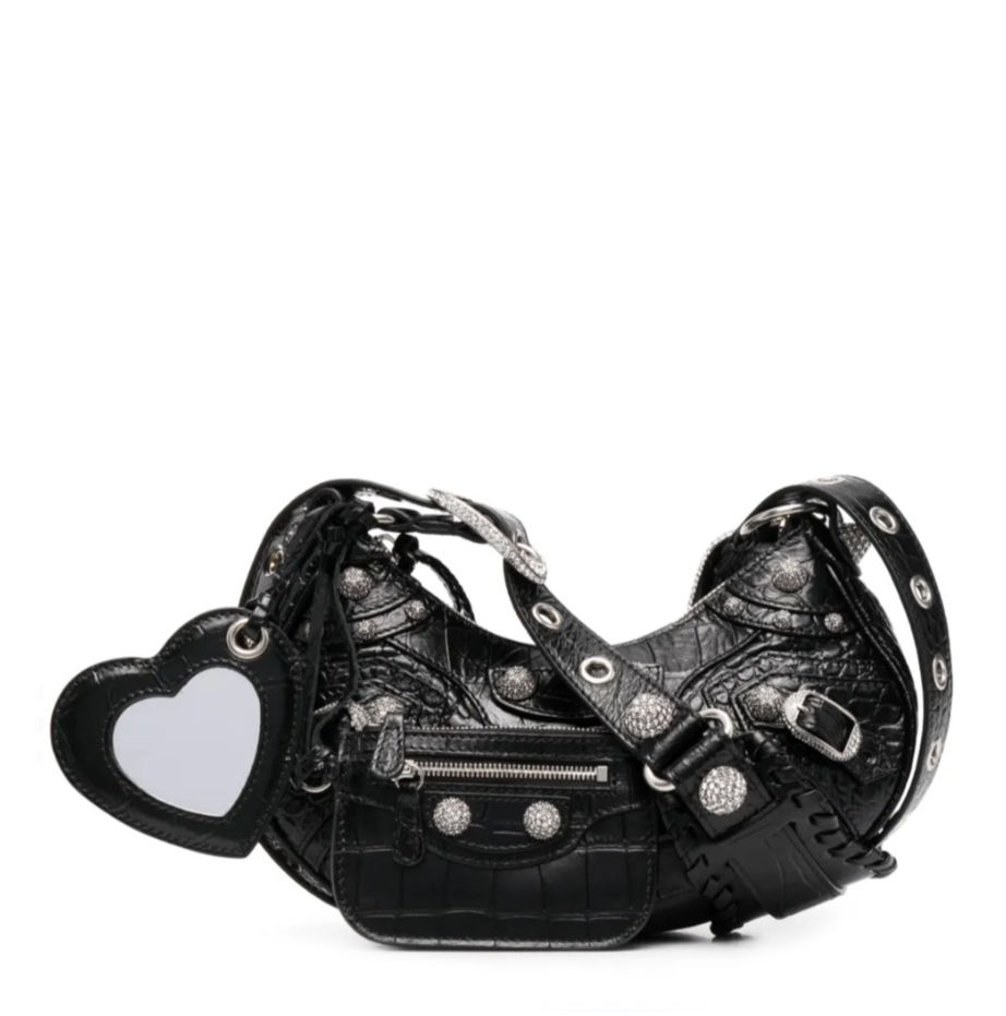 Balenciaga Le Cagole Crocodile Embossed With Rhinestones Shoulder Bag Black XS